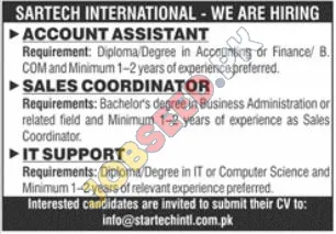 SARTECH INTERNATIONAL is actively seeking talented individuals to join their team in Pakistan. We are offering exciting career opportunities for an Account Assistant, Sales Coordinator, and IT Support professional. If you possess a relevant qualification and the required experience, we encourage you to apply for these rewarding positions. Discover your potential with a growing organization committed to professional development and a dynamic work environment. Explore these latest job openings and advance your career in the private sector.