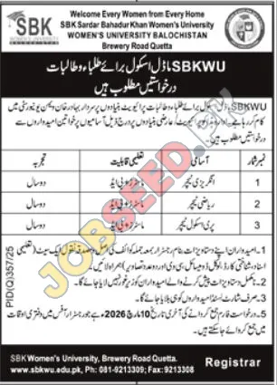 SBK Women's University Balochistan Announces Teaching Vacancies