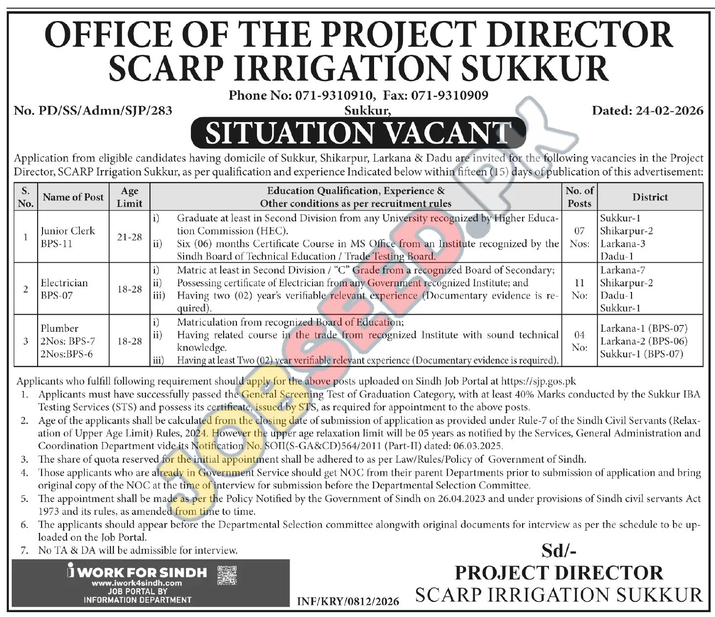 The Project Director, SCARP Irrigation Sukkur invites applications from eligible individuals with Sukkur, Shikarpur, Larkana, and Dadu domiciles for various positions. This is a great opportunity to join a government organization focused on irrigation projects. We are seeking dedicated Junior Clerks, skilled Electricians, and experienced Plumbers. Apply now to become part of our dynamic team!