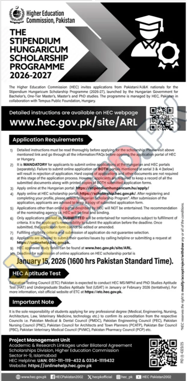 The Higher Education Commission (HEC) is pleased to announce applications for the Stipendium Hungaricum Scholarship Programme for the academic years 2026-2027. This initiative, supported by the Hungarian Government, provides opportunities for Pakistani and AJK nationals to pursue Bachelor's, One-Tier Master's, Master's, and PhD studies in Hungary. The program is managed by HEC in collaboration with Tempus Public Foundation, Hungary.