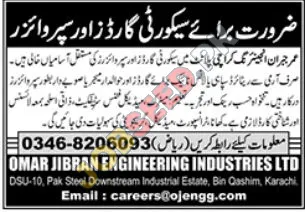 Find the latest security job vacancies in Karachi for retired Army personnel at Omar Jibran Engineering Industries Ltd. The company is hiring Security Guards and Supervisors for its Bin Qasim plant. Applicants must be retired from the Pakistan Army with specific ranks. Competitive salary and benefits are offered for these full-time positions.