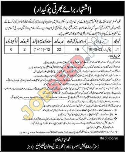 The Government of Khyber Pakhtunkhwa, through the Elementary and Secondary Education Department, is announcing job openings for Security Guards (Chowkidar) in schools under the administration of District Dir Lower. This is an excellent career opportunity in the public sector.