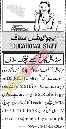 This advertisement highlights opportunities for medical educators within a private educational institution. The focus is on recruiting individuals with specific qualifications in Medical Laboratory Technology (MLT), Bio-Chemistry, and Radiology. The roles require a Bachelor of Science (BS) degree and relevant experience in teaching. This is an excellent prospect for those seeking to advance their careers in medical education and contribute to the development of skilled healthcare professionals in Pakistan.