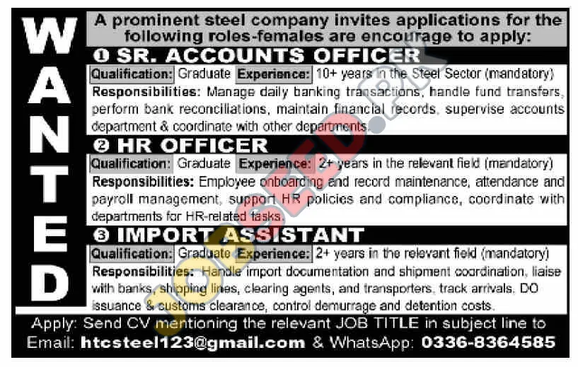 A leading private sector steel company in Pakistan is actively recruiting for several key positions to strengthen its operations. We are seeking experienced professionals for full-time employment in Karachi. The company offers a dynamic work environment and opportunities for professional development. Female candidates are strongly encouraged to apply for these roles. The available positions include Senior Accounts Officer, HR Officer, and Import Assistant, each requiring specific qualifications and experience in the relevant field.