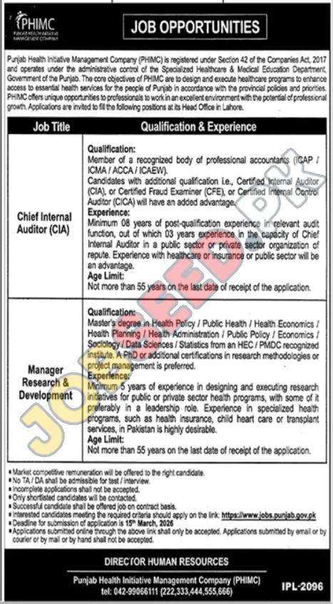 Punjab Health Initiative Management Company (PHIMC), a government entity dedicated to enhancing healthcare services in Punjab, is actively seeking experienced professionals for key roles. This is an excellent opportunity for individuals looking to contribute to public health initiatives and advance their careers within a reputable organization. Successful candidates will benefit from these top companies hiring. We are hiring for a Chief Internal Auditor (CIA) and a Manager, Research & Development, offering competitive remuneration and a dynamic work environment. Discover your next career move with PHIMC and join a team committed to making a difference in the health sector.