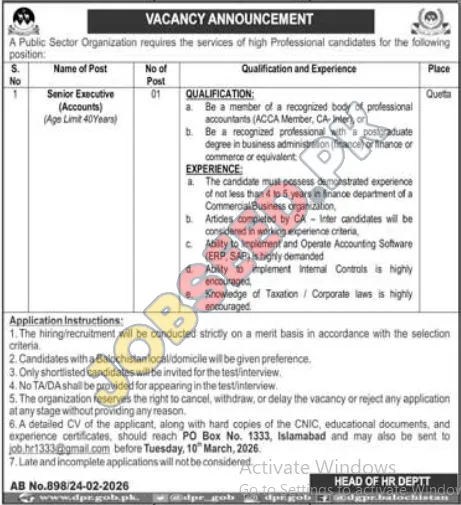 A distinguished public sector organization is actively seeking to recruit highly qualified professionals for the position of Senior Executive (Accounts). This role is crucial for maintaining the financial integrity and operational efficiency of the organization. We are committed to merit-based recruitment, ensuring that the most capable individuals are selected.