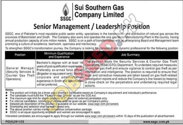 Sui Southern Gas Company Limited (SSGC), a leading public sector organization in Pakistan specializing in natural gas transmission and distribution, is announcing a Senior Management / Leadership Position. This role focuses on overseeing the Security Services & Counter Gas Theft Operations (SS&CGTO) Department. The position requires a Bachelor's degree with a minimum of 14 years of post-qualification experience, preferably with an ex-armed force background (Brigadier or equivalent rank). Corporate and administrative experience in Sindh and Balochistan is advantageous. The candidate will be instrumental in developing and executing strategies to combat gas theft, ensuring operational security, and maintaining compliance with legal frameworks. This is a contract-based position, renewable based on performance, with a maximum age limit of 57 years for external candidates. SSGC is an equal opportunity employer.