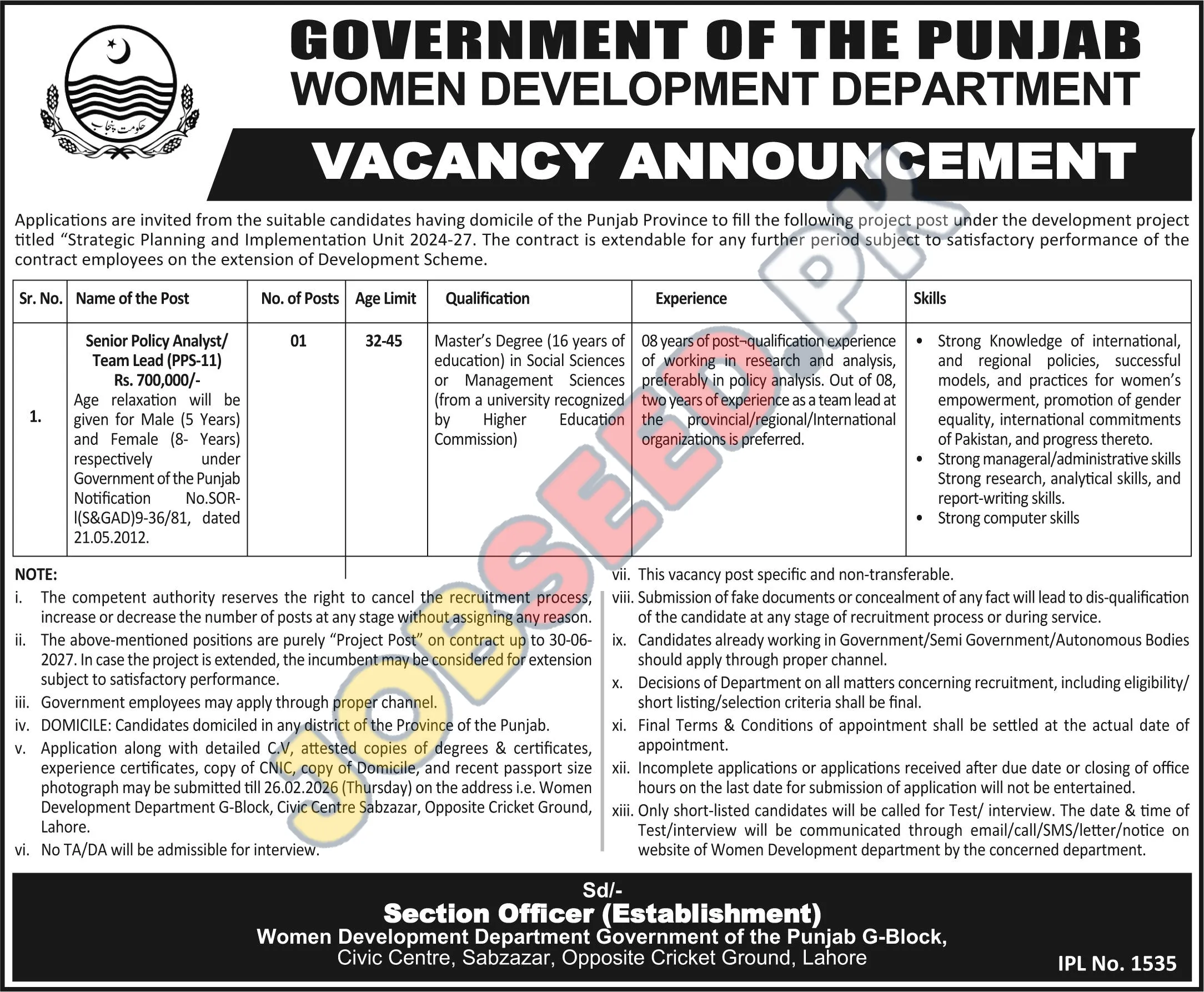 | Job Hiring Organization: | Government of the Punjab Women Development Department |