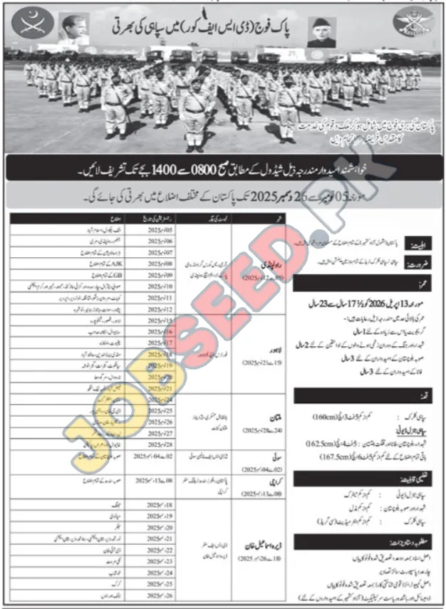 Pakistan Army is now recruiting in Karachi. Apply for the position of Sepoy (General Duty). The required qualification is Matric. This role is within the Army jobs industry. The application process commenced on 27 October, 2025. Interested and eligible candidates must submit their applications before the deadline on 26 December, 2025. This is a prime opportunity to join a renowned organization. For a step-by-step application guide and full eligibility criteria, please see the official advertisement on https://www.jobseed.pk.