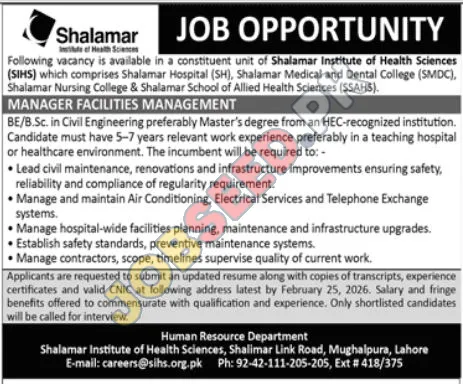 Shalamar Institute of Health Sciences: Career Opportunities for Facilities Manager