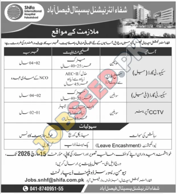 Discover exciting career opportunities at Shifa International Hospital, Faisalabad. We are actively seeking dedicated individuals to join our team as Security Guards (Male & Female) and CCTV Operators. This is a fantastic chance for individuals looking for stable employment in the healthcare sector. If you possess the required qualifications and are eager to contribute to a reputable institution, we encourage you to apply. Explore these latest job openings and advance your career in a supportive environment. We offer competitive compensation and a chance for professional growth.