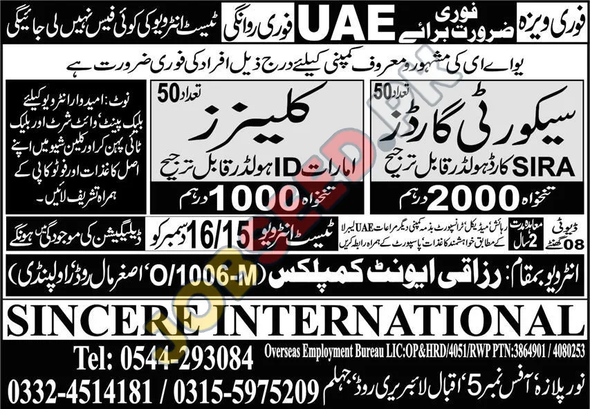 Sincere International, Abu Dhabi UAE Pakistan invites applications from eligible candidates for the post of Security Guards and Cleaners as per advertisement of 12 December, 2025, published in Express Newspaper. Matric educational qualification will be preferred.