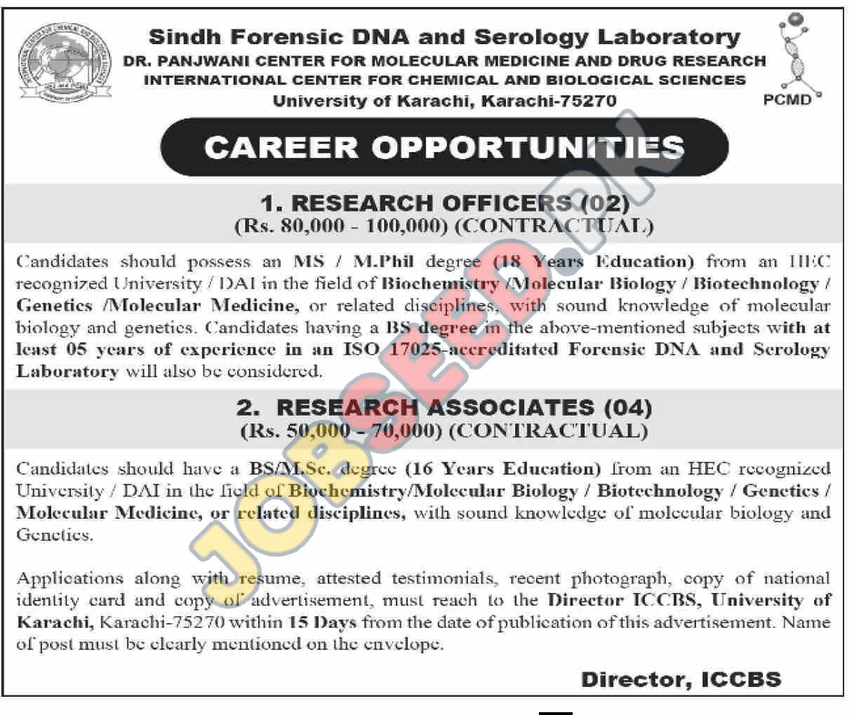 Sindh Forensic DNA and Serology Laboratory, Karachi invites applications from eligible candidates for the post of Research Officer and Research Associate as per advertisement of 26 December, 2025. Master, BA educational qualification will be preferred.