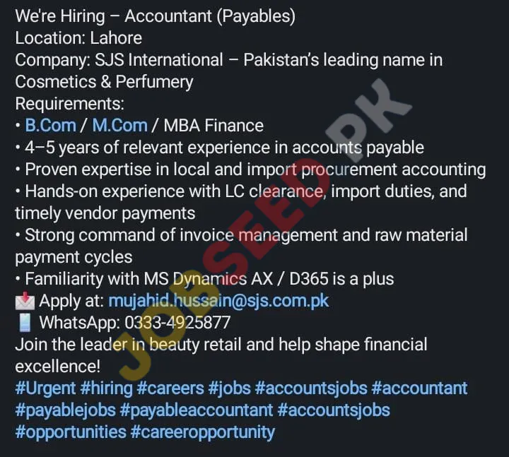 Apply at SJS International, latest jobs in Accounting department before closing date which is around 16 December, 2025 or as per closing date in newspaper ad. Read complete ad online to know how to apply on latest SJS International job opportunities. For Further details visit https://www.jobseed.pk.