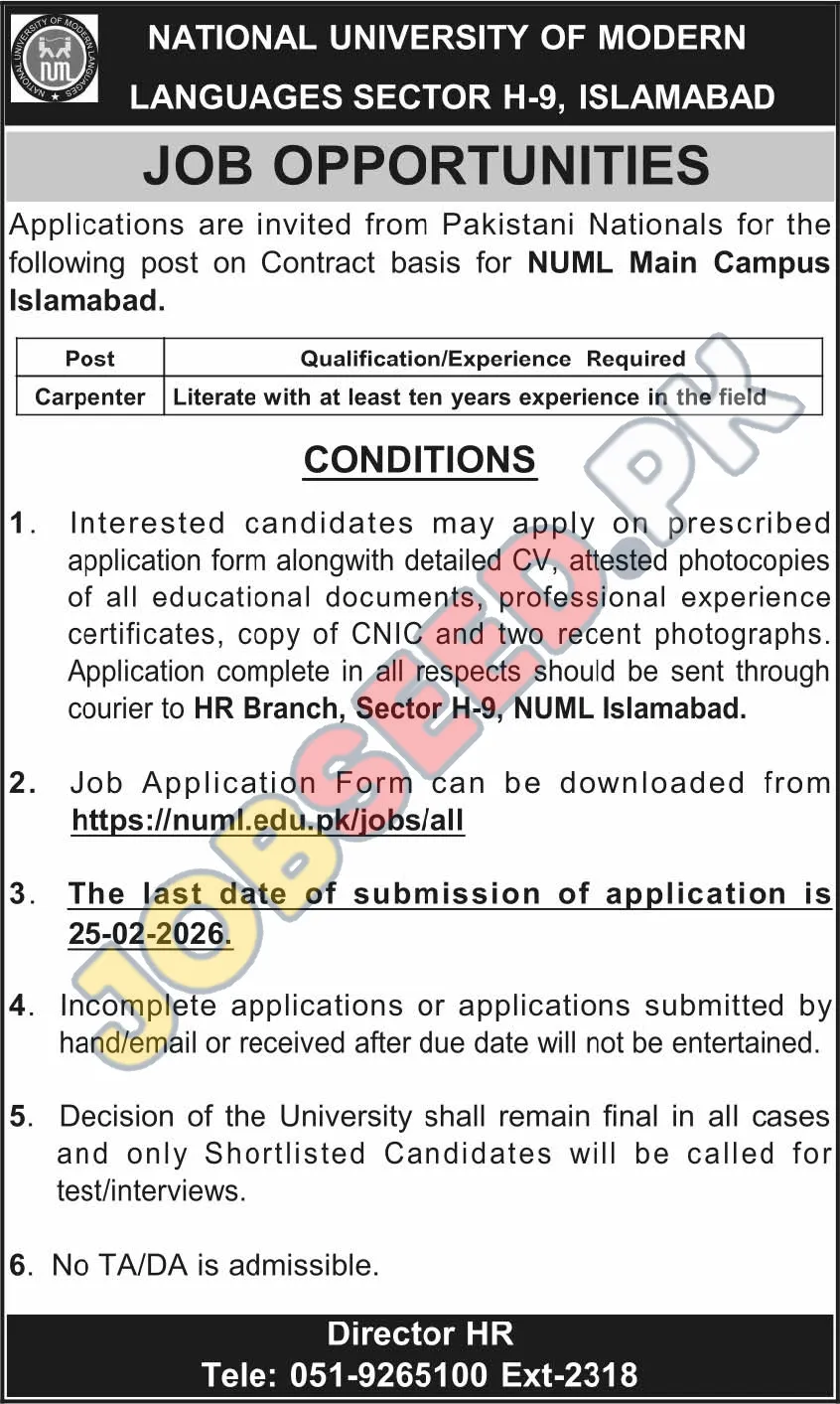 Apply for the Carpenter position at National University of Modern Languages (NUMl) in Islamabad. Successful candidates will benefit from these National University of Modern Languages (NUMl) jobs Islamabad. The role requires a minimum of ten years of experience in carpentry. The application deadline is February 25, 2026. Successful candidates will benefit from these latest jobs. Find detailed application instructions and download the form from the official NUMl website.