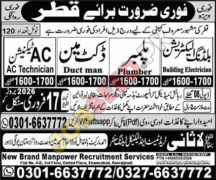Embark on a rewarding career path with a leading private sector recruitment agency seeking skilled professionals for overseas employment. We are actively recruiting for essential trades including AC Technicians, Duct Man, Plumbers, and Building Electricians. These positions offer competitive monthly earnings ranging from 1600 to 1700, with opportunities for significant career growth and international exposure. If you possess the required technical expertise and are looking for stable employment abroad, this is an excellent chance to advance your professional journey. Explore these Electrician jobs Rawalpindi with competitive benefits. We are committed to facilitating your transition and ensuring a smooth application process for these in-demand job openings.