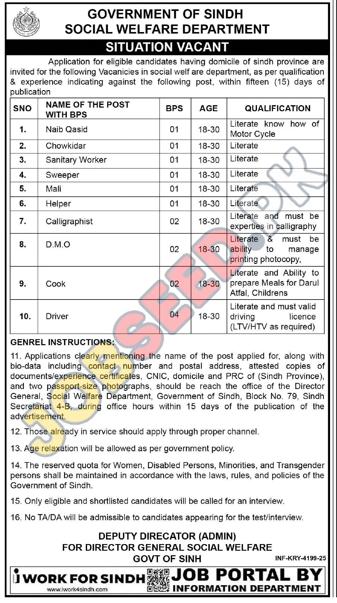 Social Welfare Department, Karachi Sindh Pakistan invites applications from eligible candidates for the post of Naib Qasid, Chowkidar, Sanitary Worker, Sweeper, Mali, Helper, Calligraphist, D.M.O, Cook and Driver as per advertisement of 13 December, 2025, published in Tribune Newspaper. Literate educational qualification will be preferred.