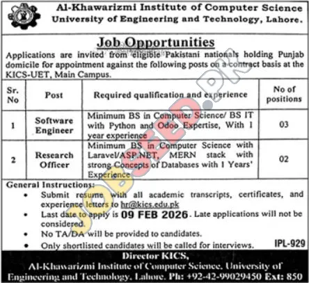 The Al-Khawarizmi Institute of Computer Science (KICS) at the University of Engineering and Technology (UET), Lahore, has announced new career opportunities for skilled IT professionals. These positions are offered on a contract basis for eligible Pakistani nationals holding a Punjab domicile. The institute is seeking highly motivated individuals to fill key roles in software development and research.