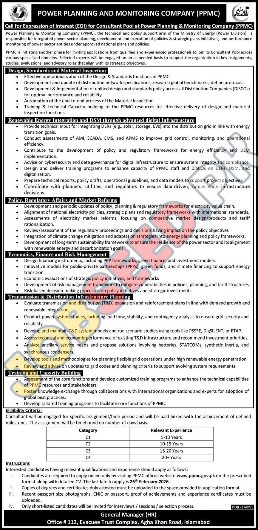 The Power Planning and Monitoring Company (PPMC), a key technical support arm of the Ministry of Energy (Power Division), is seeking highly qualified and experienced professionals to join its Consultant Pool. This government organization is responsible for integrated power sector planning, policy development, and strategic initiatives. PPMC is inviting applications from experts in various specialized domains to support key assignments and strategic objectives. Successful candidates will be engaged on an as-needed basis for specific assignments. This is an excellent opportunity for professionals with extensive experience in the energy sector to contribute to national development goals and secure competitive government employment in Islamabad.