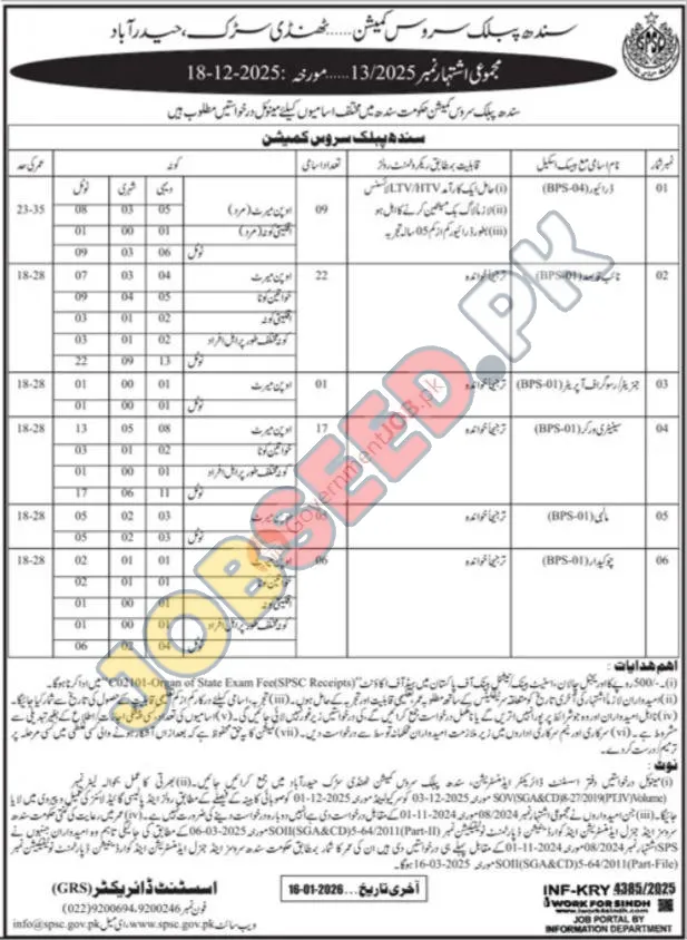SPSC, Hyderabad invites applications from eligible candidates for the post of Driver (BPS-04), Driver (BPS-04), Tuba Qasid (BPS-01), Tuba Qasid (BPS-01), Junior / Support Staff Operator (BPS-01), Sanitary Worker (BPS-01), Mali (BPS-01) and Chowkidar (BPS-01) as per advertisement of 20 December, 2025. Primary educational qualification will be preferred.