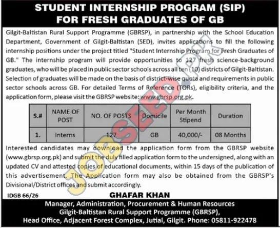 The Gilgit-Baltistan Rural Support Programme (GBRSP), in partnership with the School Education Department, Government of Gilgit-Baltistan (SED), is pleased to announce the "Student Internship Program for Fresh Graduates of GB." This government-sponsored initiative aims to provide valuable professional experience to 127 recent science graduates. Interns will be placed in public sector schools across all ten districts of Gilgit-Baltistan, contributing to the educational landscape.