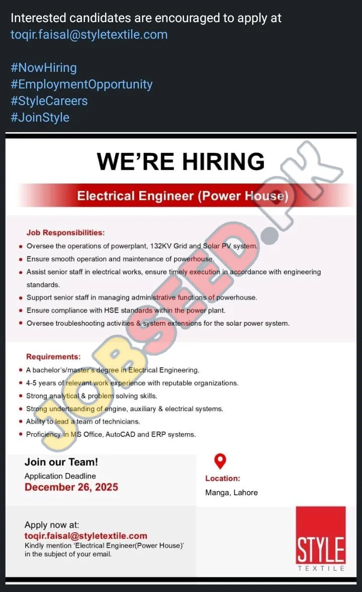 Style Textile, Lahore invites applications from eligible candidates for the post of Electrical Engineer (Power House) as per advertisement of 28 December, 2025, published in Social Media/Online . BA educational qualification will be preferred.