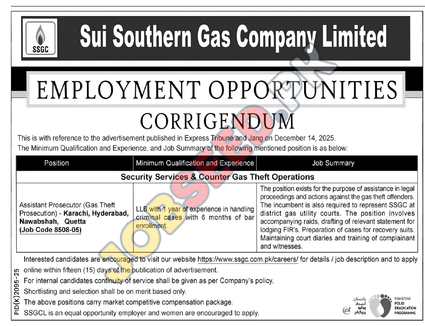 Sui Southern Gas Company Limited SSGC, Karachi Sindh Pakistan invites applications from eligible candidates for the post of Assistant Prosecutor (Gas Theft Prosecution) as per advertisement of 18 December, 2025, published in Jang Newspaper. LLB educational qualification will be preferred.