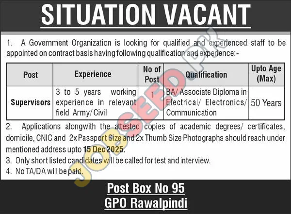 Career opportunity at Government Organization located in Rawalpindi Punjab Pakistan for the position of Supervisors. This employment notice was announced on 02 December, 2025 through Nation Newspaper. Candidates possessing a BA degree are encouraged to submit their application.