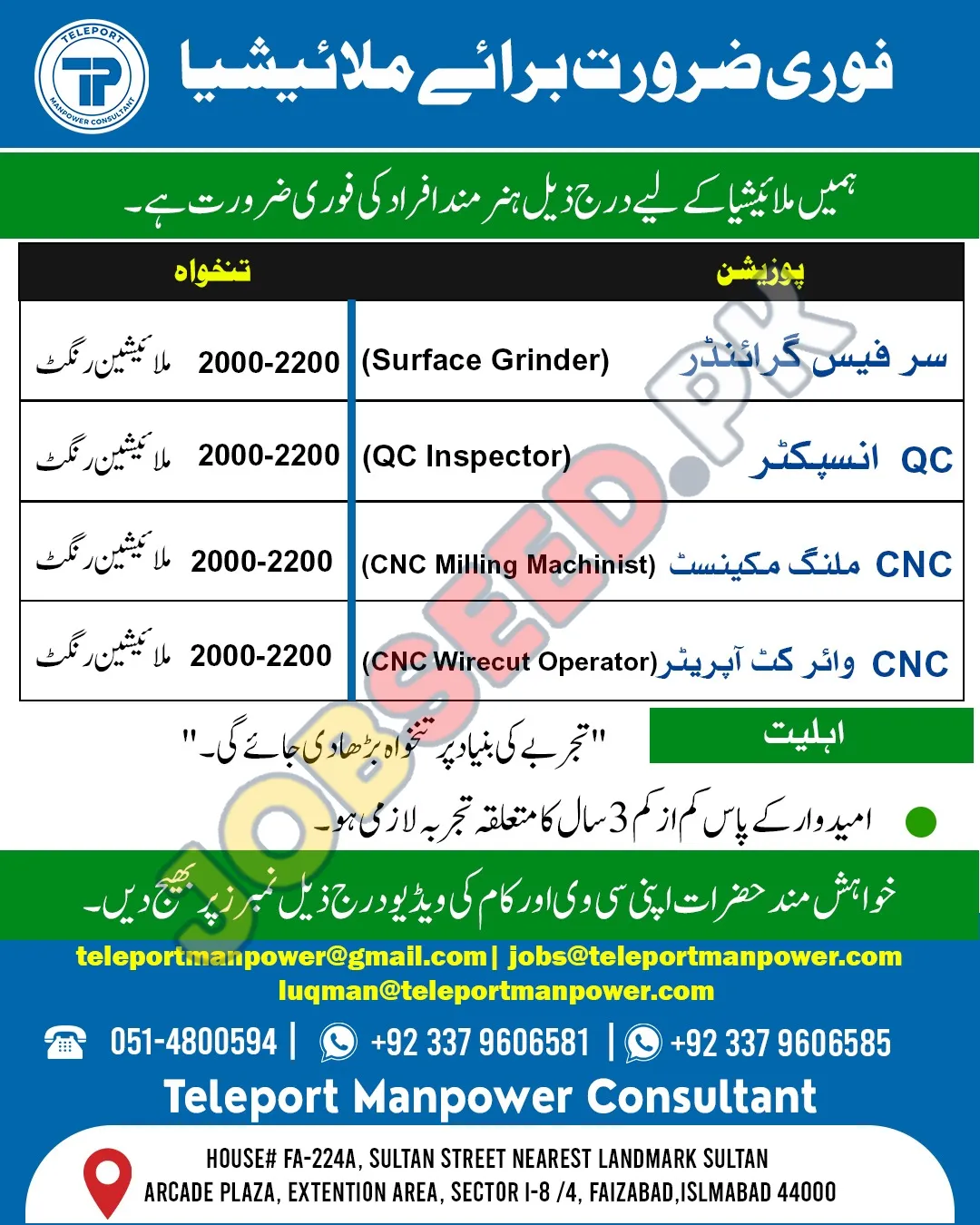 Teleport Manpower Consultant is now recruiting in Faizabad, Islamabad. Apply for the position of Surface Grinder. The required qualification is Master. This role is within the Human Resources industry. The application process commenced on 04 December, 2025 via Image Advertisement. Interested and eligible candidates must submit their applications before the deadline on 16 December, 2025. This is a prime opportunity to join a renowned organization. For a step-by-step application guide and full eligibility criteria, please see the official advertisement on https://www.jobseed.pk.