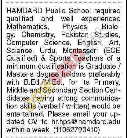 HAMDARD Public School is seeking passionate and experienced teachers for various subjects, including Mathematics, Physics, Biology, Chemistry, Pakistan Studies, Computer Science, English, Art, Science, Urdu, Montessori (ECE Qualified), and Sports. Candidates should possess strong communication skills (both verbal and written) and be dedicated to fostering a positive learning environment for students at the Primary, Middle, and Secondary levels.