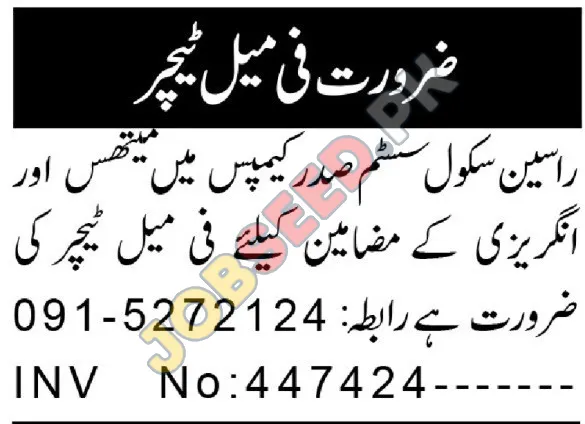 Rasheen School System, Sadr Campus, is seeking dedicated and qualified female teachers for Mathematics and English subjects. This is an excellent opportunity to join a reputable educational institution and contribute to the academic success of students. If you are passionate about teaching and meet the requirements, we encourage you to apply.