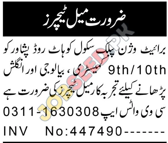 Bright Vision Public School, located on Kohat Road, Peshawar, is seeking experienced and dedicated teachers. This is an excellent opportunity to join a vibrant educational institution committed to providing quality education to its students.