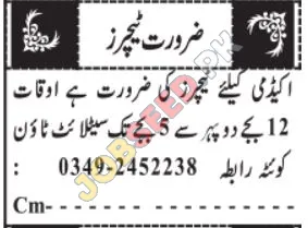Academy is now recruiting in Quetta. Apply for the position of Teacher. The required qualification is Bachelor. This role is within the Education industry. A bachelor degree is preferred. The application process commenced on 02 December, 2025 via Jang Newspaper. Interested and eligible candidates must submit their applications before the deadline on 20 December, 2025. This is a prime opportunity to join a renowned organization. For a step-by-step application guide and full eligibility criteria, please see the official advertisement on https://www.jobseed.pk.