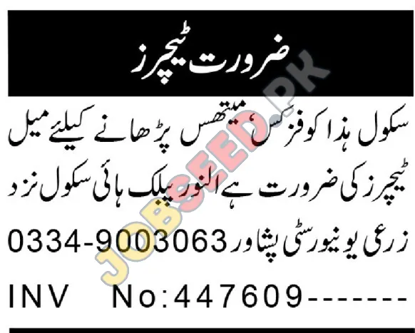 Al-Noor Public High School near the Agricultural University of Peshawar is seeking dedicated and passionate Teachers to join their team. This is an excellent opportunity to educate the next generation of thinkers and problem-solvers in a supportive and dynamic learning environment. If you have a love for Physics and Math and a desire to make a difference in young lives, we encourage you to apply.