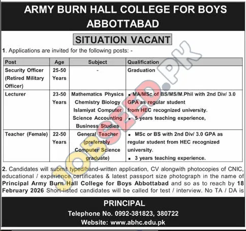 Latest Teaching and Security Vacancies at Army Burn Hall College for Boys, Abbottabad