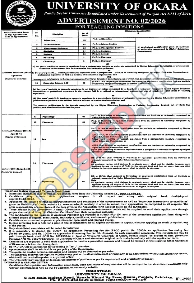 The University of Okara, a distinguished public sector institution, is currently inviting applications for various teaching positions. This is an exceptional opportunity to join a renowned academic environment and contribute to the advancement of knowledge. The university seeks highly qualified individuals to fill roles across different disciplines, offering competitive salaries and a stimulating work environment. Apply before the deadline of 31 March, 2026. Additionally, high salary jobs are available for qualified candidates. This is a great career opportunity for those seeking government jobs within reputable institutions. Additionally, Professor Positions vacancies Okara are available for qualified candidates. Explore these exciting job openings today!