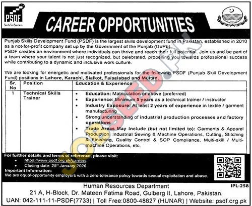Punjab Skills Development Fund (PSDF), Lahore invites applications from eligible candidates for the post of Technical Skills Trainer as per advertisement of 10 January, 2026. Master educational qualification will be preferred.