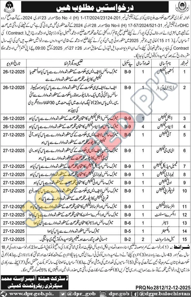 The District Health Officer Usta Muhammad is seeking qualified and dedicated individuals for various contractual positions to enhance healthcare services. These roles offer a unique opportunity to contribute to the community's well-being by serving at the Headquarter Hospital. All positions are on a contract basis until September 2025. Walk-in interviews will be held on December 26th and 27th, 2025 at the Deputy Commissioner Office Usta Muhammad.