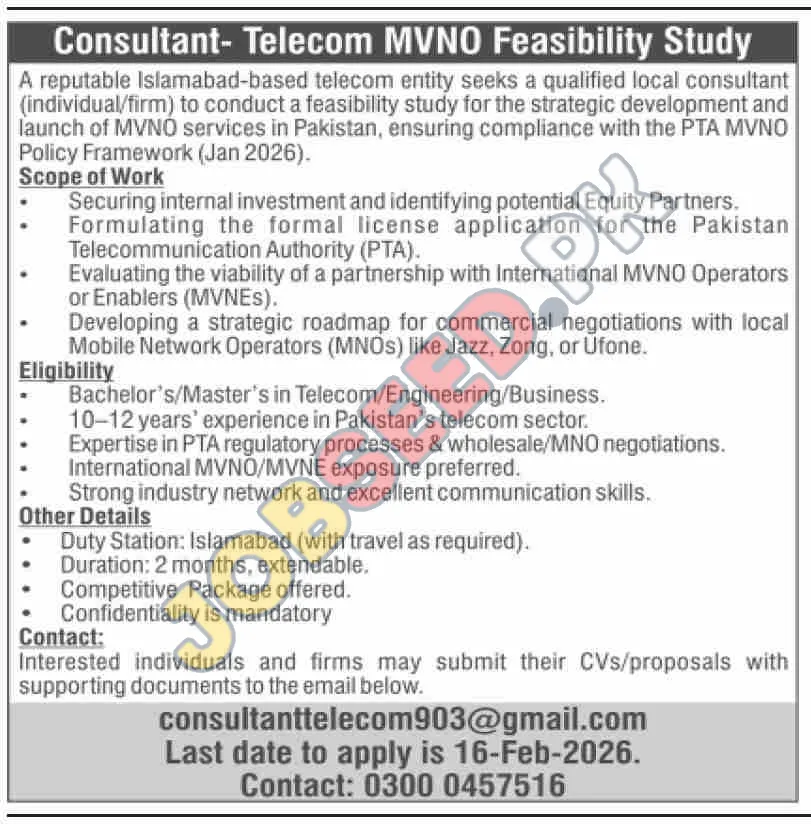 A prominent telecom entity in Islamabad is offering a significant career opportunity for a highly skilled Telecom Consultant. This contract position focuses on conducting a detailed feasibility study for the launch of MVNO services in Pakistan. The successful candidate will be instrumental in developing strategic plans, securing investments, and ensuring regulatory compliance with the Pakistan Telecommunication Authority (PTA) framework. This role requires extensive experience in the local telecom sector and strong negotiation skills to engage with major Mobile Network Operators (MNOs) like Jazz, Zong, and Ufone. If you are seeking professional growth in a challenging environment, this position offers a competitive package and a chance to shape the future of telecommunications in Pakistan.
