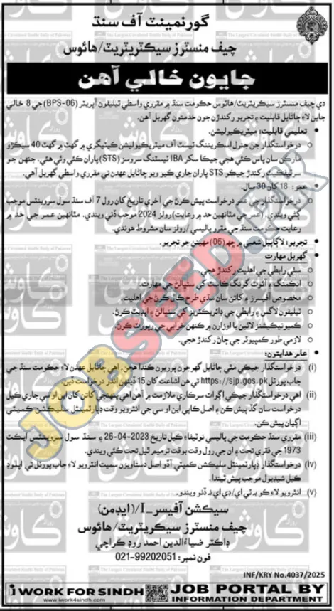 Career opportunity at Chief Minister Secretariat located in Karachi Sindh Pakistan for the position of Telephone Operator. This employment notice was announced on 04 December, 2025 through Kawish Newspaper. Candidates possessing a Matric degree are encouraged to submit their application.