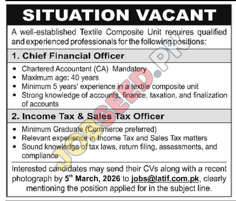 - Income Tax & Sales Tax Officer: Minimum graduate in Commerce is preferred. This role demands relevant experience in Income Tax and Sales Tax matters, along with a solid understanding of tax laws, return filing, assessments, and compliance.