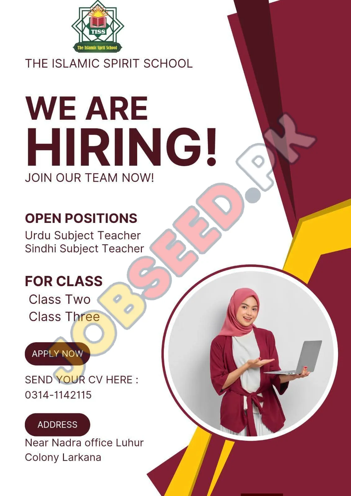 Join the team at The Islamic Spirit School in Larkana, Sindh. They are seeking to hire 2 qualified individuals for the roles of Urdu Subject Teacher and Sindhi Subject Teacher. This is a full-time position. This career opportunity was advertised on 26 December, 2025 in Social Media Adverti. The last date to apply is 07 January, 2026. Don't miss this chance to advance your career with The Islamic Spirit School. For more information and to apply online, visit https://www.jobseed.pk.