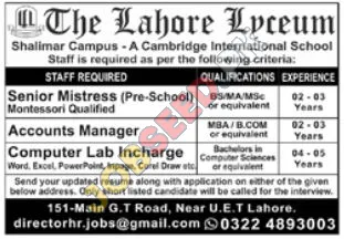 The Lahore Lyceum, Lahore Punjab Pakistan invites applications from eligible candidates for the post of Senior Mistress (Pre-School), Accounts Manager and Computer Lab Incharge as per advertisement of 14 December, 2025, published in Jang Newspaper. BS, BA, Bachelor educational qualification will be preferred.