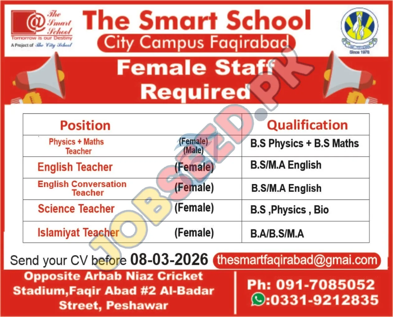 - Islamiat Teacher: Requires B.A/B.S/M.A qualification.