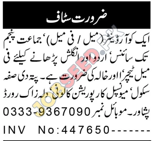 Join the team at The Suffah School in Peshawar Khyber Pakhtunkhwa, Khyber Pakhtunkhwa KPK. They are seeking to hire 2 qualified individuals for the roles of Coordinator and Teacher. This is a Full-Time position. This career opportunity was advertised on 04 December, 2025 in Aaj Newspaper. The last date to apply is 20 December, 2025. Don't miss this chance to advance your career with The Suffah School. For more information and to apply online, visit https://www.jobseed.pk.