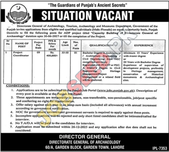 Tourism Archaeology & Museum Department, Lahore Punjab Pakistan invites applications from eligible candidates for the post of Project Coordinator as per advertisement of 13 December, 2025, published in Dunya Newspaper. Master educational qualification will be preferred.