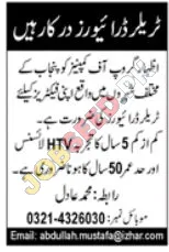 Al-Rehman Group of Companies is announcing significant career opportunities for skilled trailer drivers across Punjab. This is a fantastic chance for experienced professionals to join a leading organization in the transportation sector. We are committed to providing a stable and growth-oriented work environment for our employees. **Key Highlights:** * **Job Title:** Trailer Driver * **Company:** Al-Rehman Group of Companies * **Location:** Various cities in Punjab * **Required Experience:** Minimum 5 years with HTV license * **Age Limit:** Up to 50 years This role is ideal for individuals seeking reliable employment and a chance to contribute to the efficient logistics operations within the province. Additionally, high salary jobs are available for qualified candidates. If you are a dedicated driver with a proven track record, we encourage you to apply.Skills