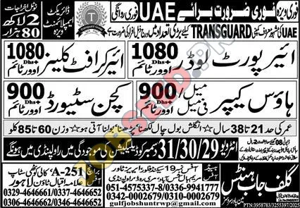 TRANSGUARD, Rawalpindi invites applications from eligible candidates for the post of Airport Loader, Aircraft Cleaner, House Keeper (Male) and Kitchen Steward as per advertisement of 25 December, 2025, published in Gulf Jobs Hunters. Master educational qualification will be preferred.