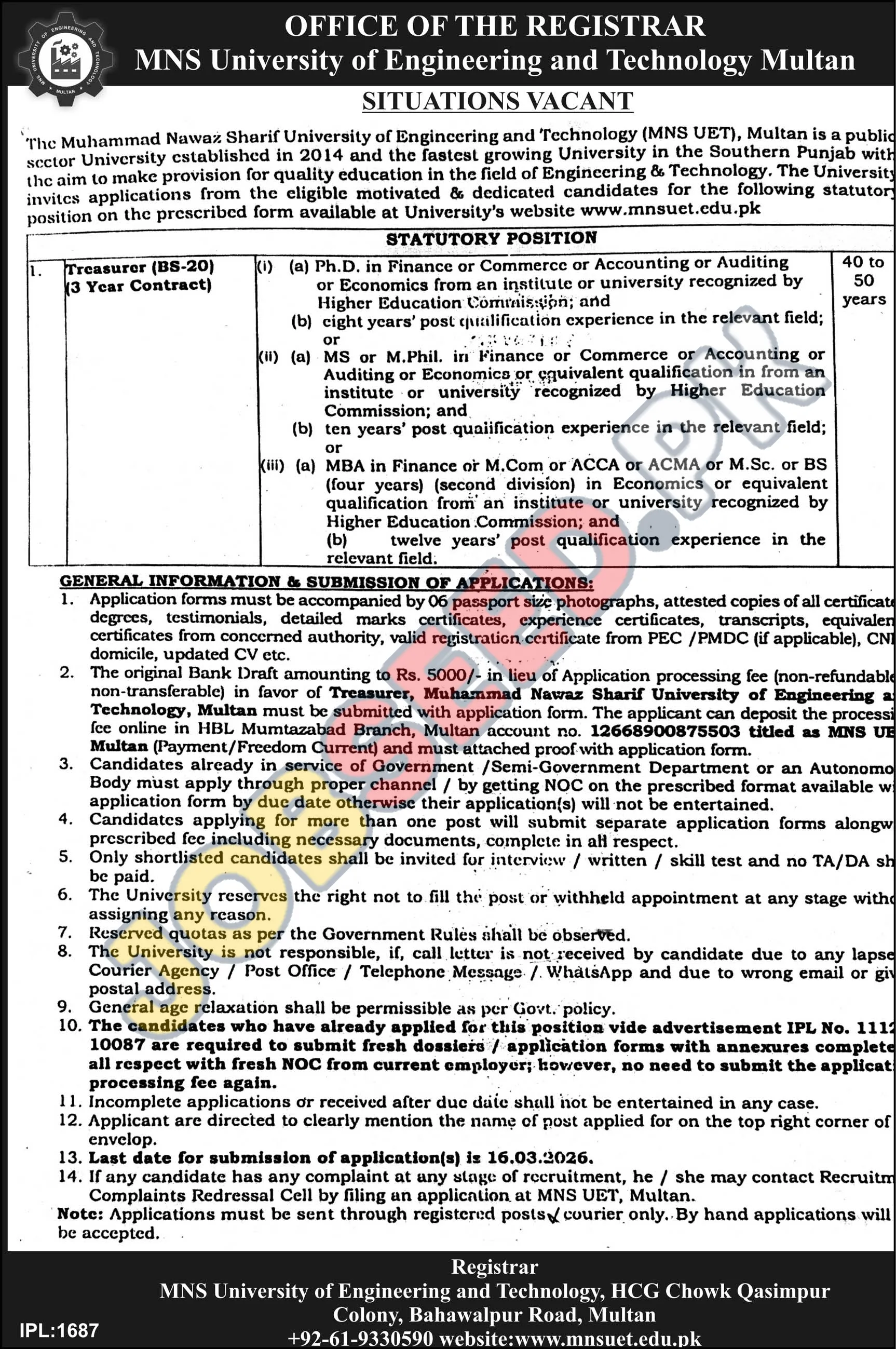 The Office of the Registrar at Muhammad Nawaz Sharif University of Engineering and Technology (MNS UET), Multan, a distinguished public sector institution, is announcing a significant career opening for the position of Treasurer (BS-20). This role is offered on a 3-year contract basis, presenting a valuable opportunity for experienced professionals to contribute to the financial governance of a growing university.