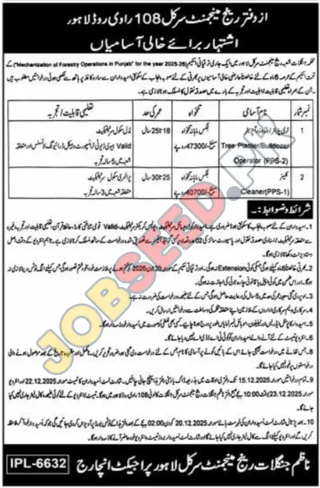 Career opportunity at Forest Wildlife & Fisheries Department located in Lahore Punjab Pakistan for the position of Tree Planter/Bulldozer Operator (PPS-2). This employment notice was announced on 25 November, 2025 through Express Newspaper. Candidates possessing a Middle degree are encouraged to submit their application.